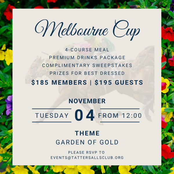 This November, members and guests are invited to our Melbourne Cup Luncheon that delivers Flemington’s exhilarating atmosphere straight to our Dining Room. Fascinators and beautifully dressed members will fill the Club as we celebrate this day with distinctive Tattersalls charm.