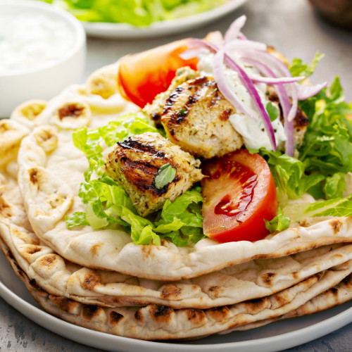 Open Souvlaki: A warm pita layered with crisp cucumber, roma tomato, pickled red onion, creamy labneh, and smoky baba ganoush. Finished with an oregano dressing and your choice of grilled chicken or falafel. A refined take on a Mediterranean classic, vibrant, balanced, and full of character.